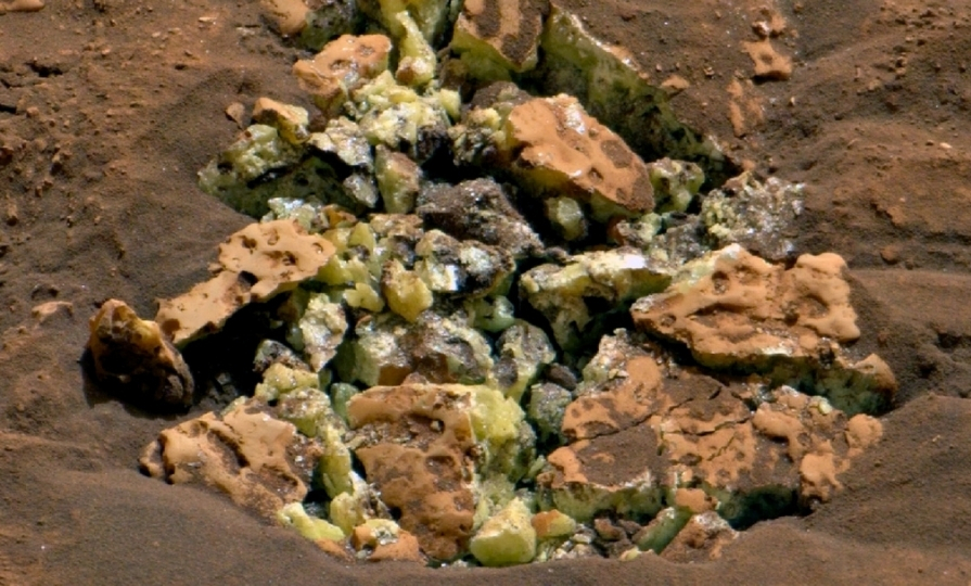 ขณะที่ยานคิวริออซิตีซึ่งมีน้ำหนักเกือบ 900 กิโลกรัมกำลังเคลื่อนตัวผ่านร่องน้ำเกดิซวัลลิส ตัวยานได้บังเอิญเหยียบก้อนหินแร่เปราะบางจนแตกออก สิ่งที่ซ่อนอยู่ภายในคือผลึกสีเหลืองของธาตุกำมะถันบริสุทธิ์ แม้ว่าสารประกอบอย่างซัลเฟตจะพบได้ทั่วไปบนดาวอังคาร แต่การพบกำมะถันในรูปแบบธาตุบริสุทธิ์เช่นนี้นับเป็นครั้งแรก ยิ่งไปกว่านั้น บริเวณรอบ ๆ ยังเต็มไปด้วยก้อนหินที่มีลักษณะคล้ายคลึงกับก้อนที่ถูกเหยียบจนแตก ซึ่งบ่งชี้ว่ากำมะถันบริสุทธิ์อาจมีอยู่มากมายในพื้นที่แห่งนี้