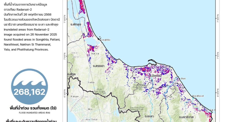 GISTDA หรือสำนักงานพัฒนาเทคโนโลยีอวกาศและภูมิสารสนเทศ (องค์การมหาชน) ได้เผยชุดข้อมูลล่าสุดจากดาวเทียม Radarsat-2 เมื่อวันที่ 26 พฤศจิกายน 2568 พบสถานการณ์น้ำท่วมขังรุนแรงในพื้นที่ลุ่มต่ำและเขตชุมชนของ…